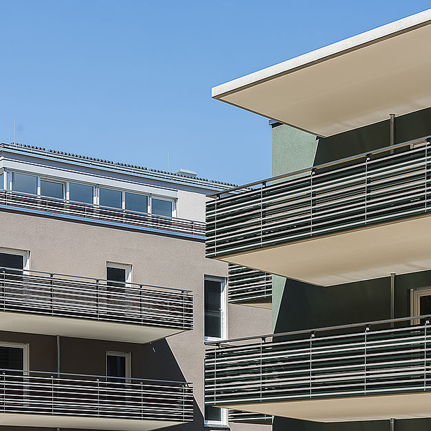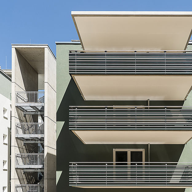 Die Wohnungen sind über offene Treppenhäuser und verglaste Aufzüge, über „Stege“ mit Glasbrüstungen zu erreichen.