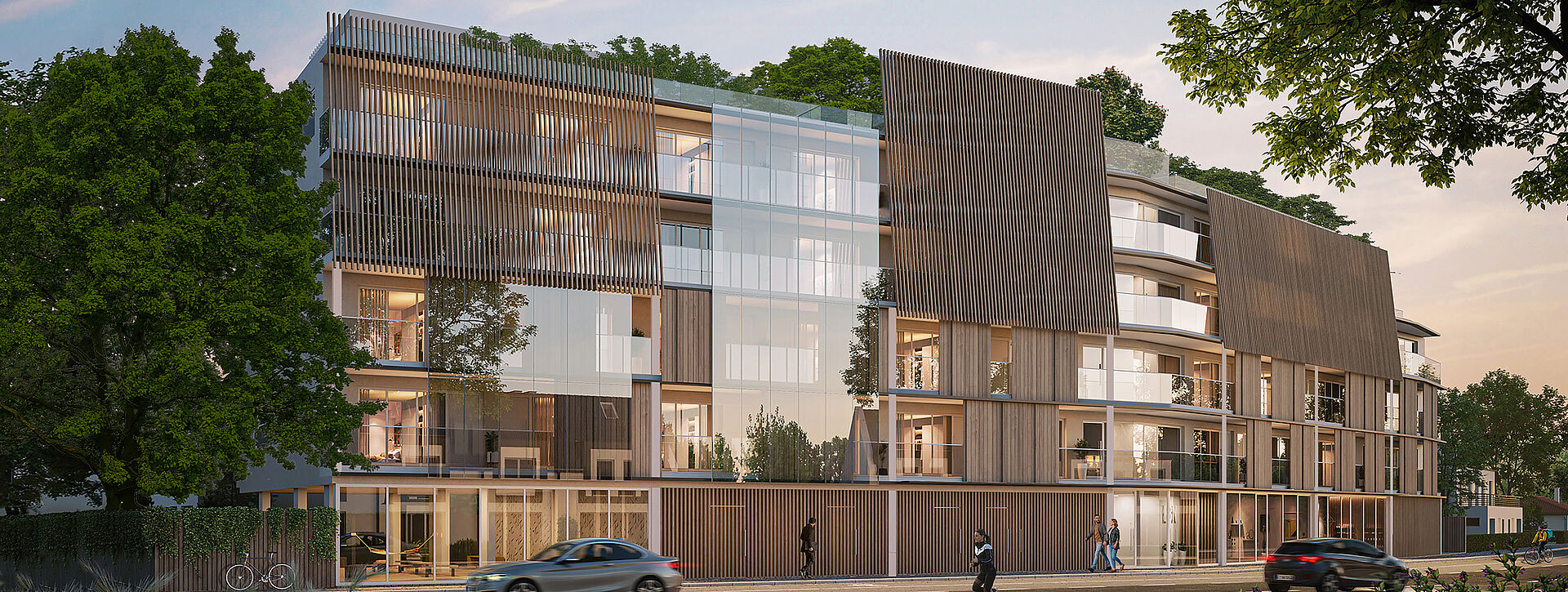 Die Tragstruktur als Betonscheibenbau ermöglicht offene Fassaden – insbesondere nach Westen. Die Terrassierung aller Wohnungen schafft private Freibereiche mit hoher Aufenthaltsqualität. Das Gebäude erfüllt den EH 40-Standard und wird QNG-Plus-zertifiziert.