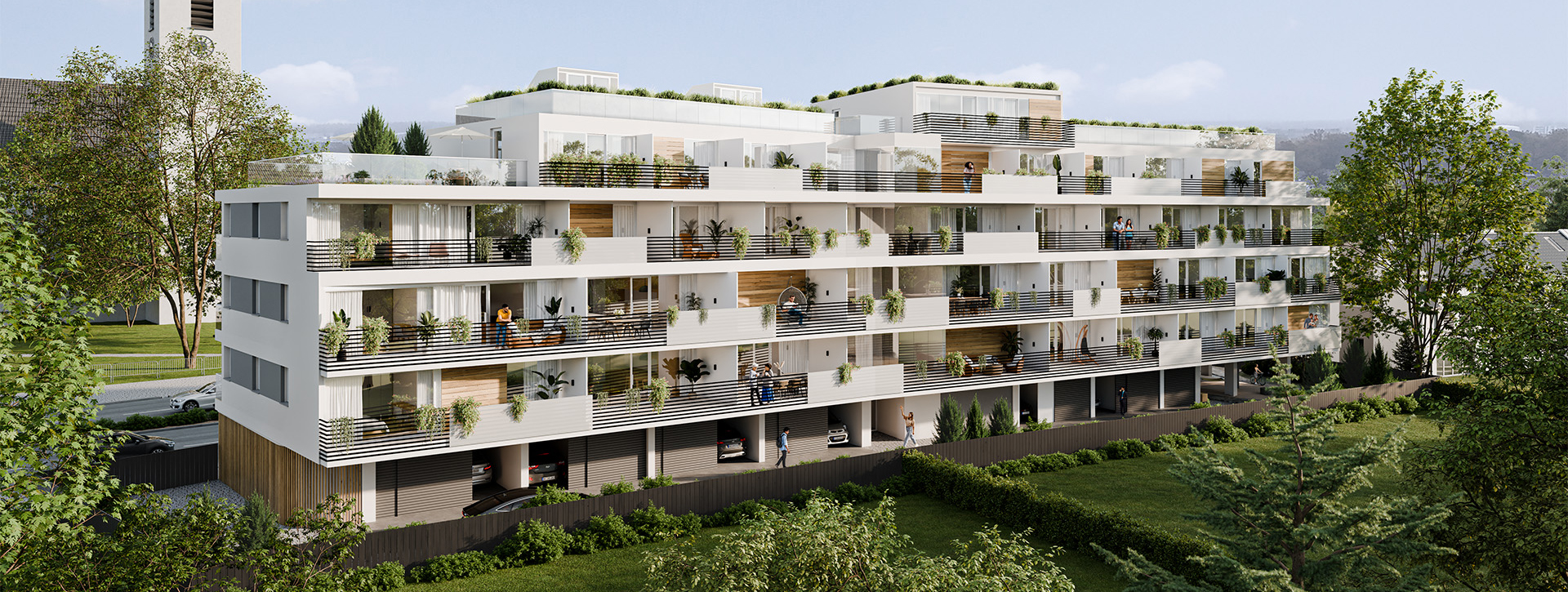 Der Neubau setzt einen markanten städtebaulichen Akzent an der Eibacher Hauptstraße. Im Dialog mit der Kirche St. Walburga und dem Modehaus Käferlein entsteht eine neue urbane Ordnung. Die Setzung des Baukörpers schafft Dichte, definiert Grünräume und stärkt die räumliche Kante des Straßenraums.